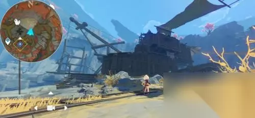 第一个“风板”在图示传送点旁边,“风板”在碎石堆的下面,我们可以用双手剑打破碎石堆。 其他“风板”,只要按照图示路线前行,都能容易看到,“风板”的位置就不再细说了。 最后,【调查】得到一件供物,高翔之翎。 悬崖旁边有一个风场,我们顺着风场前行,可以收集到一块“老石”。 第6件供物 图示传送点出发,前往图示地点。
