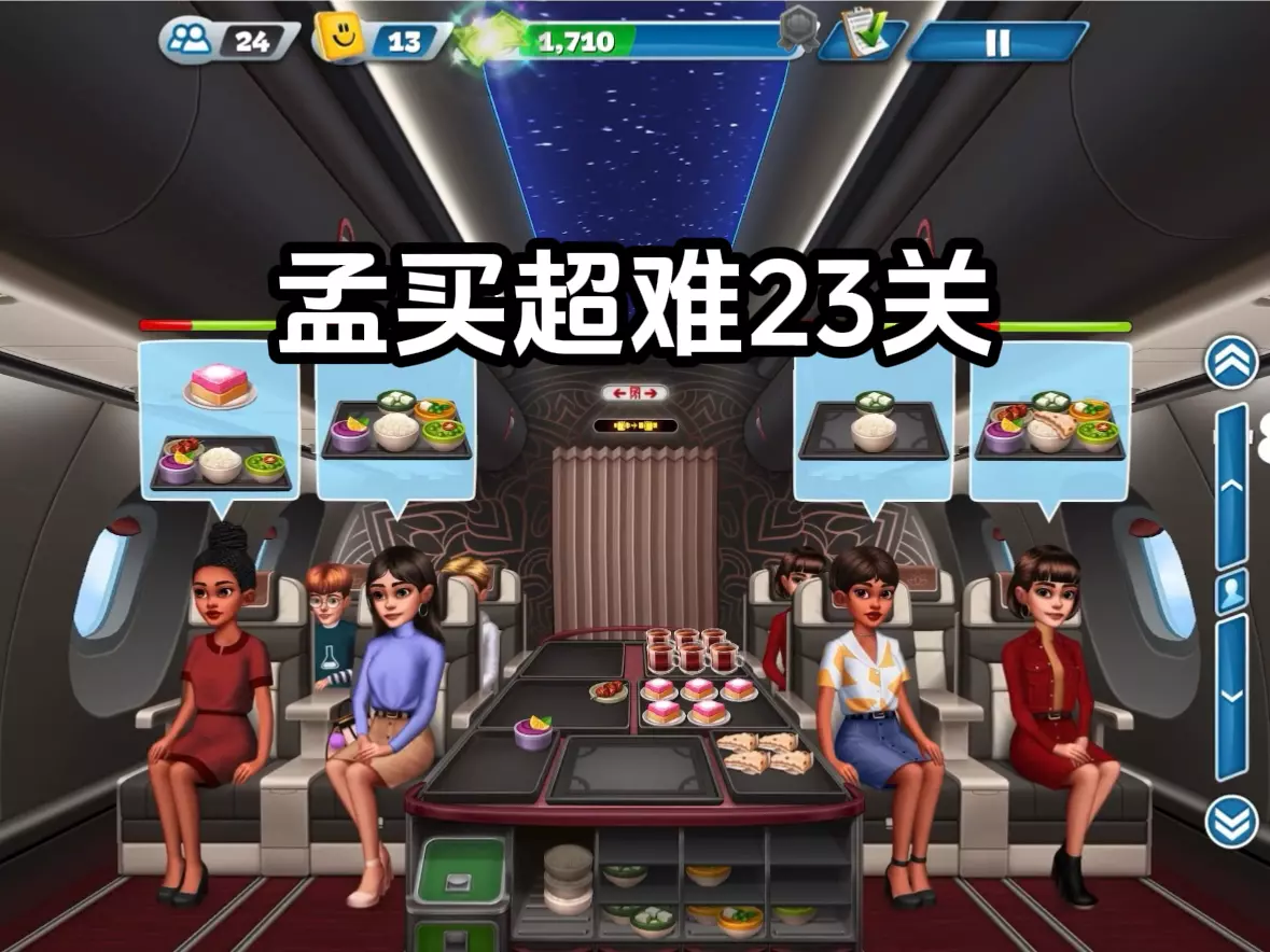 这是手游《飞机大厨》孟买关卡的游玩内容分享,展示了孟买关卡的解锁界面、机舱内的操作场景,包括制作餐食、准备餐具等操作过程,还分享了对关卡内甜点、空姐形象的游玩感受,目标是拿下孟买第一关三星。