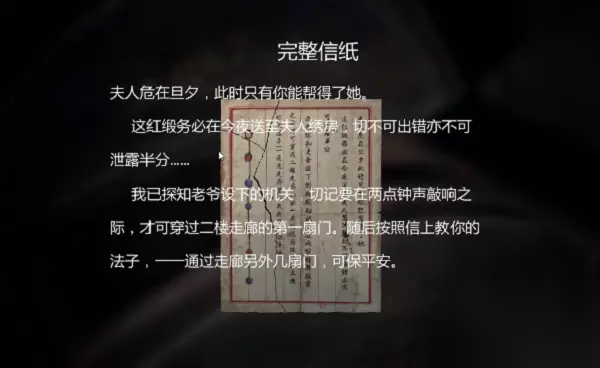 第一关通关技巧: 1、在游戏开始玩家需要获得所有信纸的碎片组合成一张完整的信纸,每一个棺材中都有信纸的碎片,收集完后,再上楼梯,楼梯的右边第二关棺材中还有两张信纸碎片,这样就能集齐一张完整的信纸了。 信纸合成后可以看到完整的图片: