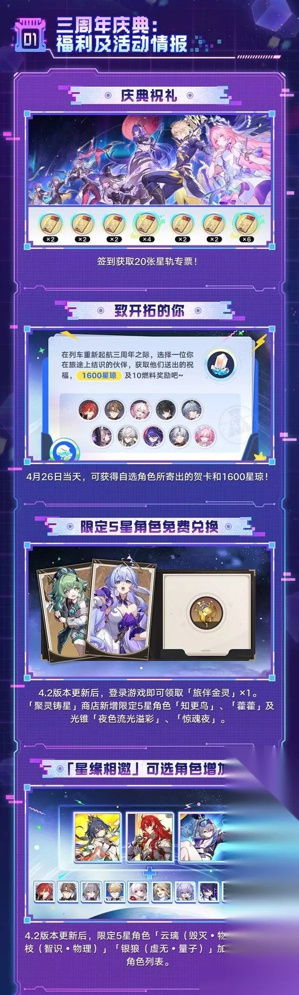 4.2版本周年服福利汇总(AI整理) 登录与签到福利:签到 7 天可领 20 张星轨专票。4 月 26 日周年庆当天,邮件发放 1600 星琼与 10 管燃料。 角色与光锥兑换福利:可使用旅伴金灵在 “聚灵铸星” 商店兑换藿藿、知更鸟等限定五星角色,还可兑换落日时起舞、夜色流光溢彩等限定五星光锥。 材料掉落福利:位面分裂、异器盈界、花藏繁生三个活动同时开启,内圈遗器、外圈遗器、基础材料全部三倍掉落。 充值相关福利:首充双倍重置。开启累充活动 “拾梦韶华”,累计获取古老梦华可解锁对应奖励,最高可获得随宠 “狸狸记者团”。此外,还有 1 元、30 元特惠礼包限时上架。 外观道具福利:遐蝶时装 “幽梦翩跹” 限时特惠。可购买开拓穿搭头饰 “酷酷酷目镜”“浣熊熊爆改绯绯狐” 等,还可在 “星尘之礼” 商店兑换帕姆衣装 “黄金美梦!礼服套装” 等道具。
