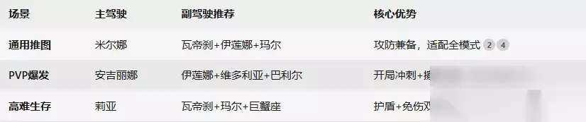 米尔娜+瓦帝刹+伊莲娜+玛尔 核心机制: 米尔娜(主驾驶):战火熄灭技能可触发5次,每次使BOSS停止攻击7秒,期间攻击力提升1.5倍。 瓦帝刹(副驾驶):满血状态下可免疫秒杀,每局限2次。 伊莲娜(副驾驶):拾取掉落包回复生命值,保障续航。 玛尔(副驾驶):战斗超60秒后提升攻击力,叠加米尔娜的爆发效果。 优势:适配所有模式(无尽、PVP、闯关),性价比高且未来版本兼容性强。 金牛座+巨蟹座(平民首选) 搭配逻辑: 金牛座(主驾驶):暴击增伤与充能火花技能提升输出。 巨蟹座(副驾驶):护盾技能增强生存能力,与金牛形成攻防互补。 资源消耗:碎片易获取,同步升级至30级即可解锁核心技能。 二、模式专属组合推荐 PVP巅峰对决 主驾驶:安吉丽娜 激活荣耀擦弹连携技能,提升无尽模式分数。 副驾驶:伊莲娜+维多利亚+巴利尔 伊莲娜:回血保障生存;维多利亚:强化攻击;巴利尔:开局冲刺缩短战斗时间。 闯关模式 主驾驶:黛比 技能提升全队攻击力,适合快速推图。 副驾驶:莉亚+瓦帝刹+玛尔 莉亚:星辰守护护盾抵挡密集弹幕;瓦帝刹:防秒杀机制应对高伤BOSS。 三、高性价比氪金驾驶员推荐 莉亚(天龙座) 技能:每30秒生成能量护盾(每局限5次),主驾驶生效。 定位:生存核心,适配闯关、无尽等高压力场景,需通过抽奖或活动获取。 布莱德(白羊座) 技能:充能火花提升爆弹威力32%,适合搭配核弹流副武器。 获取途径:碎片可通过海盗宝箱和任务系统收集。 四、资源管理与养成建议 平民玩家优先级 优先培养金牛座+巨蟹座组合,碎片通过无尽模式、日常任务获取。 每日刷取英雄难度关卡(如第88关)积累进阶材料。 氪金玩家策略 定向抽取天龙座、莉亚等高阶驾驶员,利用光辉祈愿活动获取本体光辉。 主驾驶核心升格至Lv.4以上,解锁额外属性继承。 五、版本T0组合总结