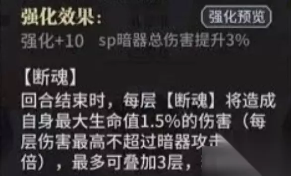 暗器排行与领域解析 一、暗器强度排行 T0(绝对核心) 一千零一夜:全方位攻击,群伤能力顶尖。 T1(高强度泛用) 观音泪:最强单体暗器,无视防御,永不落空,可弑神。 冥花鸠蕊:高爆发+控制,适配毒系阵容。 凤引九雏:多段穿透伤害,克制高防单位。 T2(战术特化) 断刃:破甲+流血,适合持久战。 T3(中规中矩) 佛怒唐莲:范围爆炸伤害,但需近战触发。 阎王帖:剧毒秒杀,但对高抗性目标乏力。 孔雀翎:驱散增益+降免伤,泛用性较高。 T4(特定场景) 暴雨梨花针:8连击+禁暴,但触发率低。 菩提血:暴抗削弱+回血,冷门但功能性尚可。 T5-T6(过渡/材料) 诸葛神弩:效果命中提升,仅适合控制队。 袖剑/含沙射影:基础暗器,前期过渡使用。