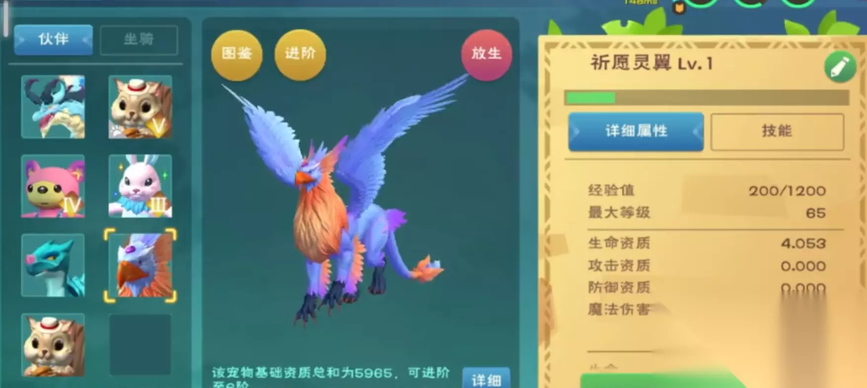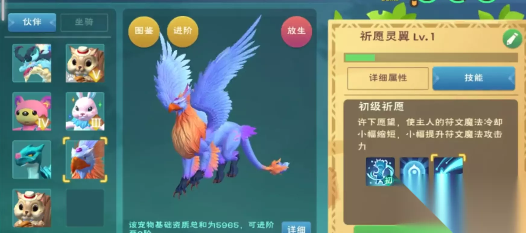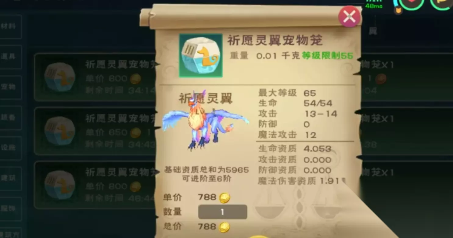祈愿灵主要扮演辅助型远程攻击角色,其群伤特性和魔法伤害输出能力使它在面对集群生物时特别有效,而在PVP环境中则适合近战角色携带。这款宠物的进阶系统允许它最多提升到6阶,每阶都会带来资质的显著增长,初始1阶资质为4834,2阶为5249,3到6阶则能达到5721点。