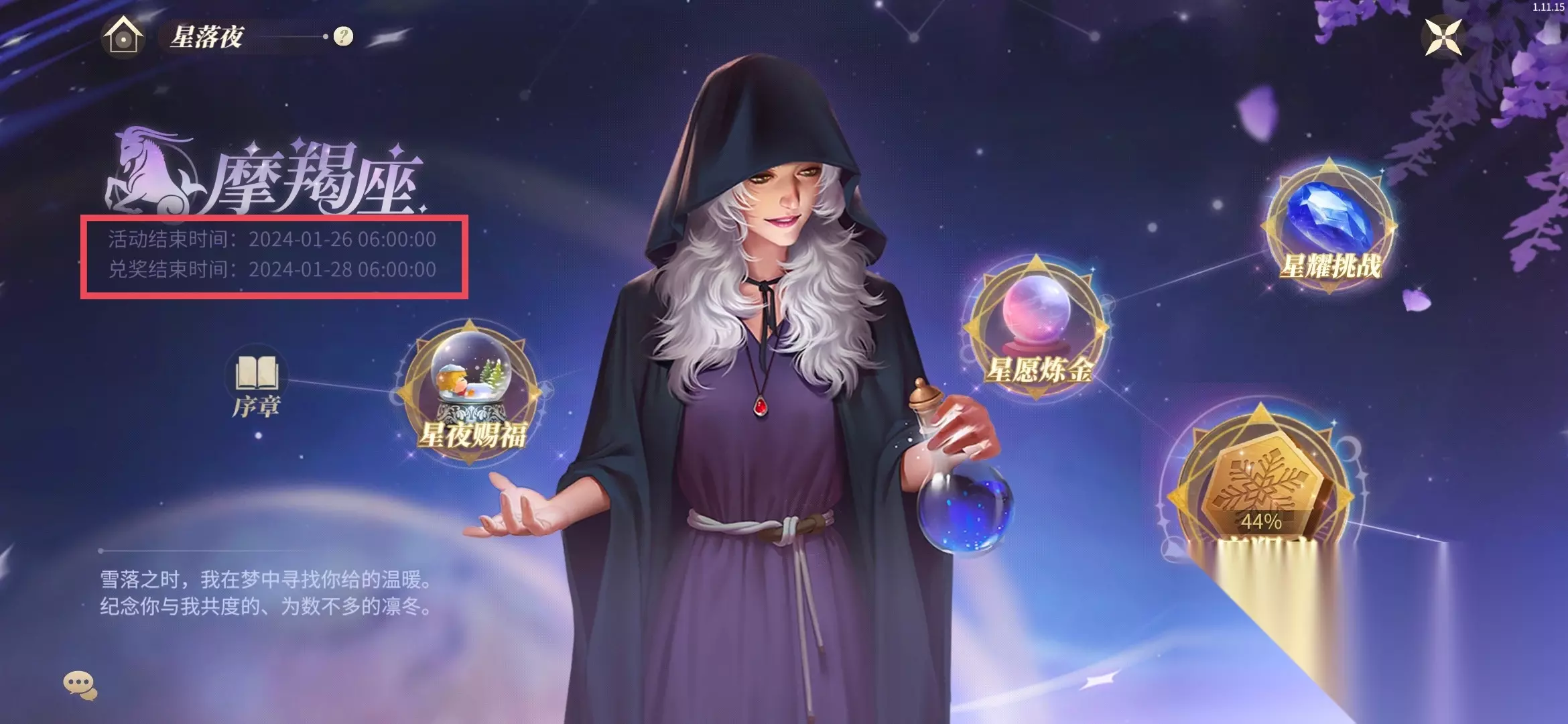 ❧ 活动时间 ❦ 2024.1.13-2024.1.26 活动期间,可通过活动任务的陆续开放完成目标任务,在体验星座任务剧情的同时,还可获得丰厚的活动奖励,包含奖励收藏品【梦中的温暖】、庄园外观【威尼斯水城】、摩羯座♑专属头像框、梦中的温暖手稿、彩虹光辉、特技阅历书、皇家寻访公函、极速饲料、极速肥料、勇敢徽章、彩虹石、高级阅历书等~ ❧ 活动介绍 ❦ 一、星夜剧情