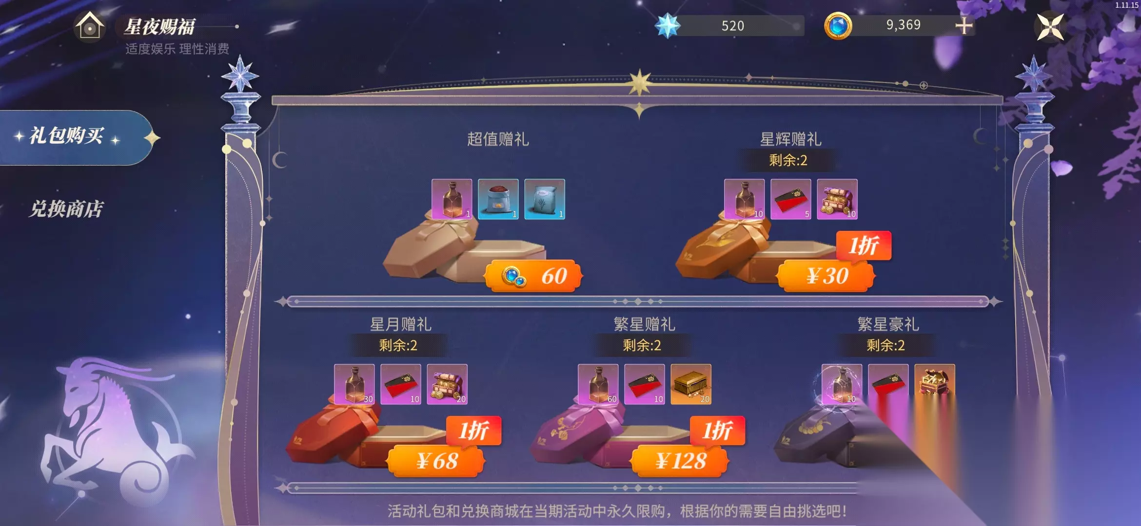 兑换商店上方还有礼包可以购买,玩家可以按照自己的需求进行购买。 ————————【0氪玩家】———————— ①星耀石: 430+1240=1670 (星夜剧情)+(星耀挑战) ②生命药水: 1. 4×14=56(酒窖制作) (「1.12」 1天 + 「 1.13~1.25 」13天=14天) (1.26日6点整结束昂~所以那天不计入!) 【温馨提示】: 酒窖额外产出对于祝福药水是有效果的…! 故实际获得的祝福药水是56+,各有不同~ ③星耀石优先兑换顺序为: 收藏品【梦中的温暖】→皇家寻访公函/特价预知卡→皇家采集证/皇家狩猎证/皇家商会特令/商品需求清单→肥饲料→预知卡 —————————【分割线】————————— 上述内容就是关于【摩羯座♑星座活动】的奖励介绍及玩法说明啦~ 因为现在是活动初期嘛,所以内容可能有点误差,后续俺还会进行修改哒…! 那么至此,绝酱恭祝各位小可爱们游玩愉快嗷~ ╰(*´︶`*)╯