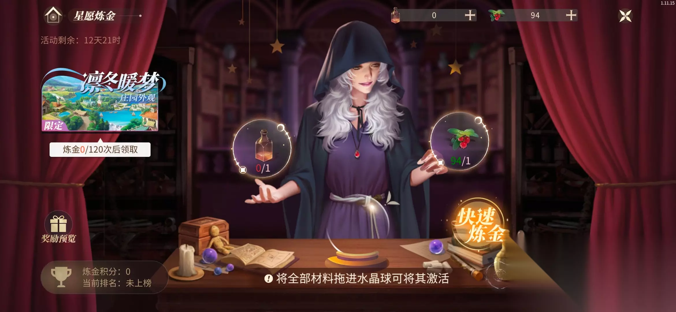 介绍:玩家可以通过给女巫提供生命药水(配方通过星夜剧情解锁;制作所需的小麦麦芽、黑麦麦芽可通过领地副本里的萤火之森获取;制作所需的野生蔓越莓可通过商店购买)、野生蔓越莓,进行炼金(可快速炼金),每次炼金将会增加10点积分,积分可参与炼金排名,炼金排行榜仅展示前100位名单,炼金排名奖励将在活动结束后以邮件的形式发放。 快速炼金:快速炼金为自动炼金,固定消耗10次炼金所需材料的数量,完成10次炼金操作。 每次炼金还可以掉落随机奖励,比如:【梦中的温暖】、梦中的温暖手稿、彩虹光辉、特级阅历书、皇家寻访公函、极速饲料、极速肥料、勇敢徽章、彩虹石、高级阅历书、高级肥料、高级饲料、智慧徽章、彩虹碎块、中级阅历书、毅力徽章、彩虹碎片。 炼金次数达到120次后, 即可领取庄园外观·威尼斯水城~