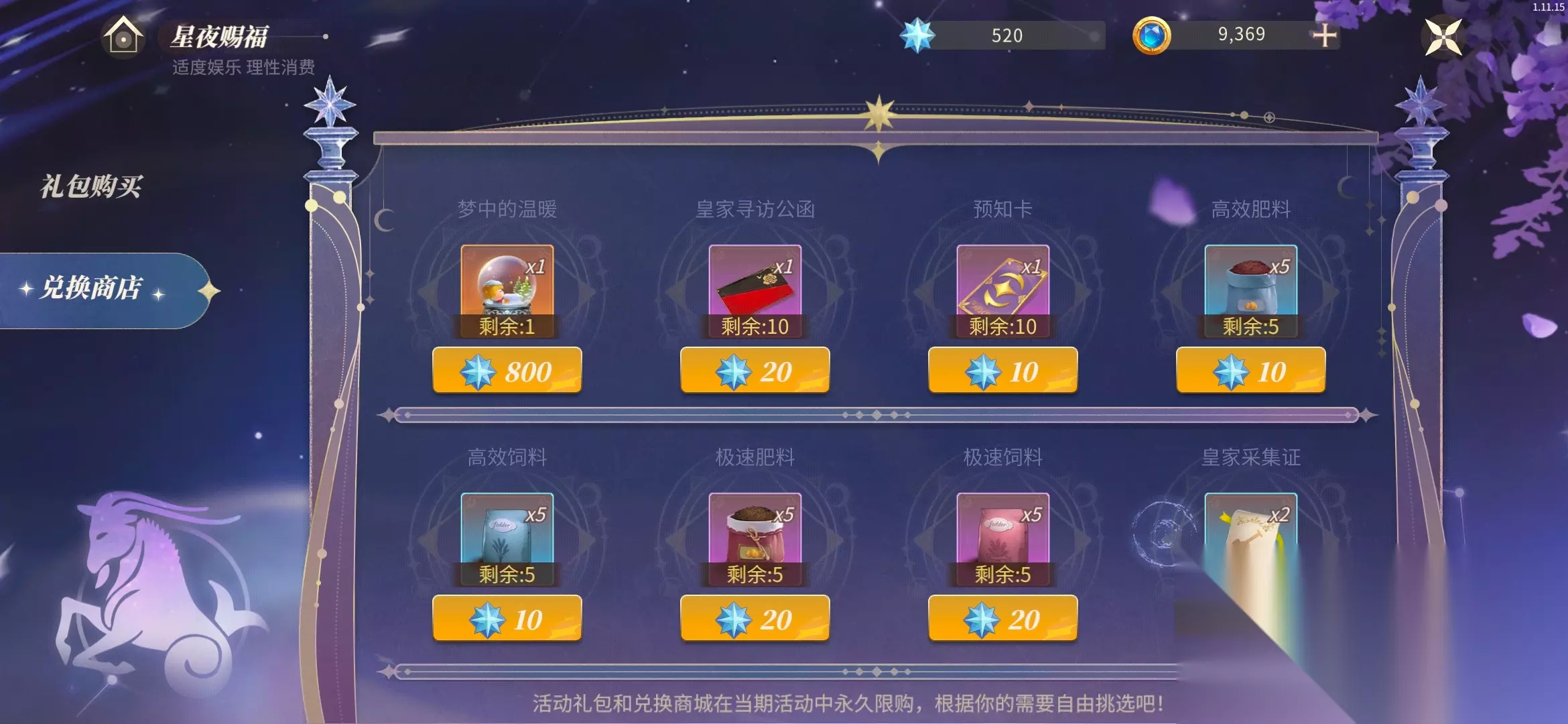 介绍:玩家在射手座活动中收集到的星耀石均可在星夜赐福中进行兑换相应物品,包括本次活动的收藏品【梦中的温暖】、皇家寻访公函、预知卡、肥饲料、各种凭证等奖励。