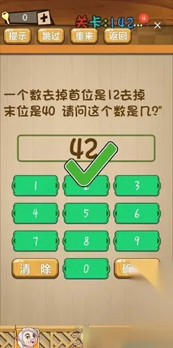 关卡题目:一个数去掉首位是12,去掉末位是40,请问这个数是几。 通关答案:42,四十二,去掉四就是十二,去掉二就是四十。 以上就是神脑洞第142关怎么玩的内容,小伙伴们学会了吗?希望对大家有所帮助,更多神脑洞游戏相关的攻略,请持续关注233乐园网。
