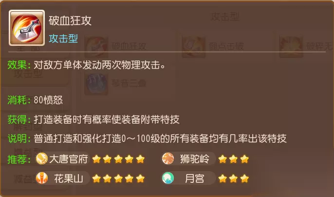 推荐配置破血狂攻、破碎无双这两大物理型输出特技,提升战斗灵活度及消耗能力。有条件的少侠还可配置碎甲术、罗汉金钟,分担队伍辅助压力。