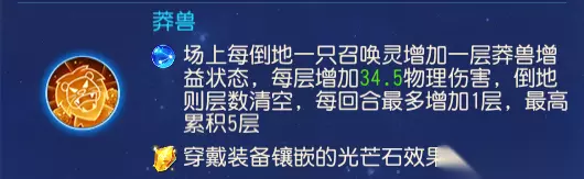 整体思路如下:前期通过狮搏、连环击集火召唤灵单位(优先攻宠),获取兽决技能,顺带积累莽兽以及鹏程万里层数,后期再通过强化后的鹰击一举击溃对手。 (二)装备配置 狮驼岭镶嵌莽兽后可提升镶嵌光芒石20%的效果