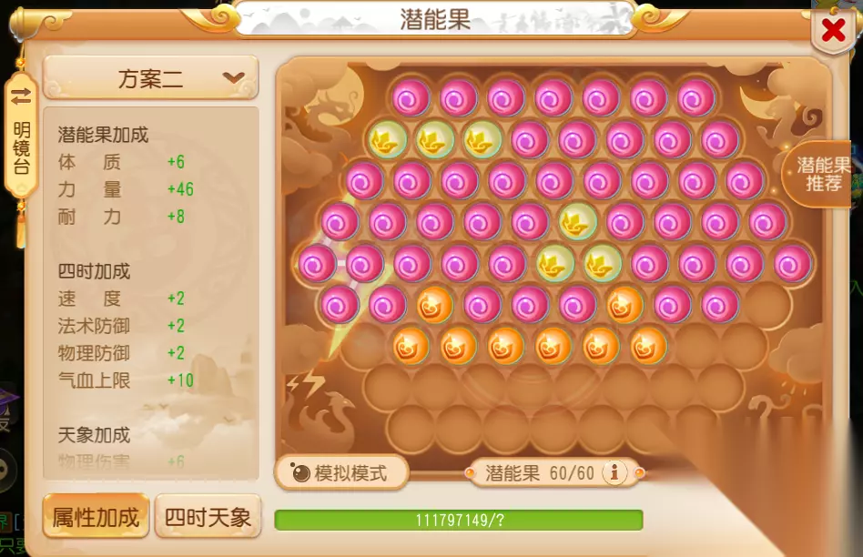 (四)潜能果 狮驼岭玩家需要尽可能多地配置力量潜能果,确保激活“小暑”带来的物理暴击加成即可。以60个潜能果为例,推荐按照如下方式进行摆放: