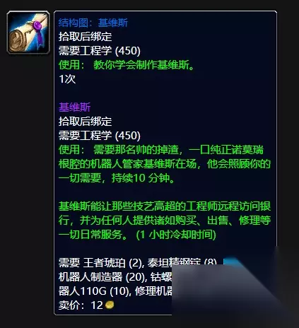TBC怀旧服P5阶段上线后,维修机器人是所有SW金团中使用最多的物品之一。祥子哥记得开荒第一周,SW朋友做了30个野外修复机器人110G,才2天就用完了(个人。买卷轴),团长直接拨款让他再做一个30人。 80级版本的团队副本难度不低,维修机器人自然需要大量使用,但80级维修机器人已经升级,基维斯登场。 80级制作基维斯的玩家不在少数,所以提前储备一些基维斯材料,到了80级绝对能赚大钱。