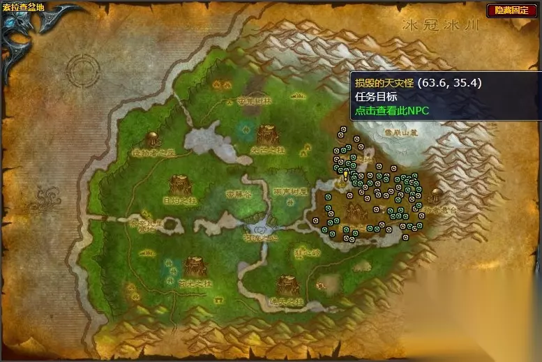 进入迷失之地,消灭6个毁坏的天灾怪和10个骨镰劫掠者,以此获得弗蕾亚的信任。 任务怪位置图