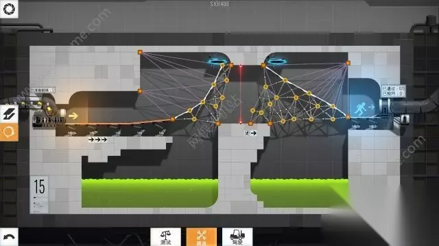 通关攻略 两条桥梁,可以说是一模一样的结构,先搭建好桥梁的骨架,然后两侧天花板上的锚点最好是使用钢索连接桥面,这样可以大大降低成本。