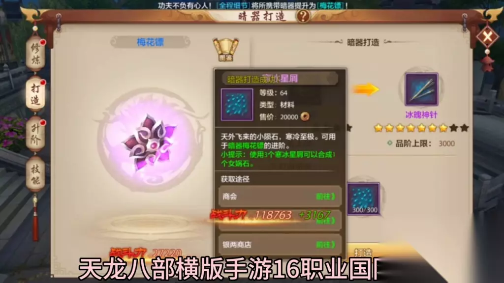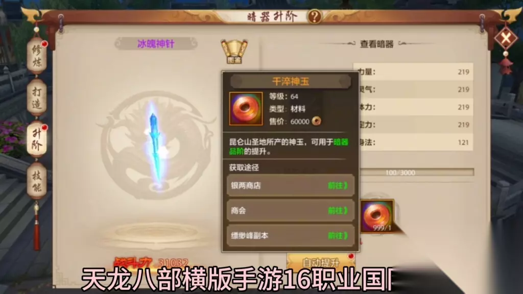 当然,肝硬化等级达到一定程度后,也可以在缥缈峰副本银两商城和商人处获得。 接下来是进阶。大哥们,什么是进阶呢?进阶是突破当前等级,比如现在是88级,需要突破冰破神针,需要顶满3000。由于目前需要的材料是先千锤神玉,同样的,千锤神玉可以在营养商城、商会中的商人处和缥缈峰副本中获得。这些材料只能从这些地方获得。 第三种方法是技能。许多大哥不知道这些技能有什么效果。这时,我们可以在浏览中查看第一条属性,了解暗器技能的效果。