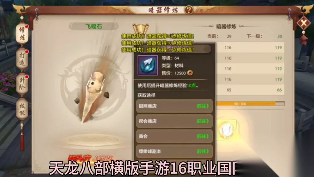 今天我来为大家讲解暗器的玩法和步骤。首先,打开暗器时,我们可以看到有许多暗器石,但不要担心,暗器分为两种:暗器修炼石和升级石。 第一种是暗器修炼石。许多玩家会问,暗器修炼石需要多少?最终需要两万三百多个暗器修炼石才能完成。