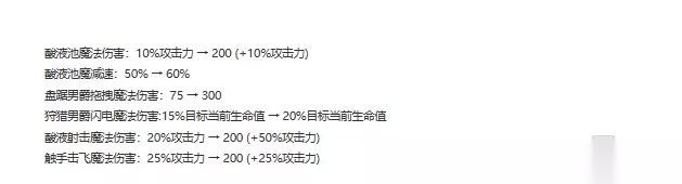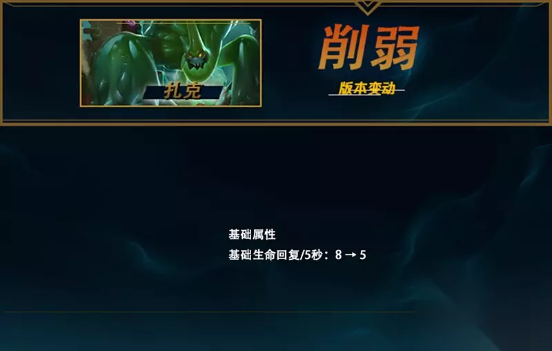 斯卡纳作为重新登场的英雄,成为了一个很强的上单英雄。这次的调整主要是削弱主W的消耗流玩法,而将强度转移到Q技能的肉搏上。Q技能的伤害、法力消耗、增益时长和再次释放时间都有所加强,且幅度不小。显然,主Q的加点的肉搏能力和清野能力都会有较大的提升。0.6的AD加成总算让斯卡纳的装备利用率和征服者利用率都有较大的提升,之前看着一身生命值加成都头疼。 除此之外,为了强化斯卡纳的持续作战能力,略微削弱了成长法力值,将部分强度转化到了成长法力回复上,在拉长的时间线上强化了斯卡纳持续作战的续航能力。 扎克 削弱