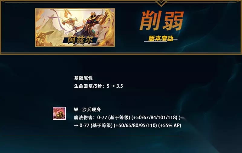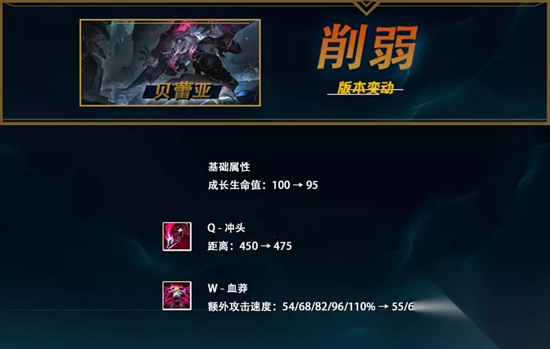 生命回复降低,W技能随技能等级的成长略微降低(现在都是主W打法,削弱是体现在前期伤害上)。沙皇是个典型的比赛英雄,这次的调整主要也是针对于赛场的。对线时的抗压能力和换血能力略有下降,但是这些改动对打架频繁的路人局影响不大。 贝蕾亚 削弱