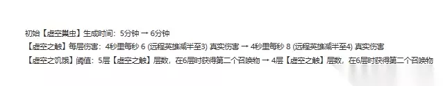 这些强化都是针对大龙的技能的,而大龙的技能基本都可以被走位躲避。因此,这个改动更多是针对于一些懒惰的玩家,脚下生根对于打大龙来说可不是一个好习惯呦。除此之外,对于大龙争夺战时先手开大龙的一方来说,也会面临更大的风险。 虚空巢冲 调整