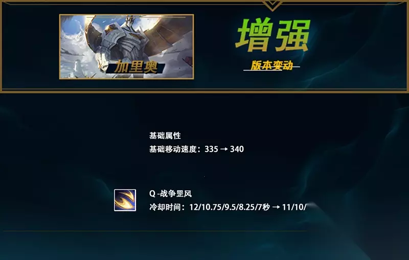 与阿卡丽类似,Q技能基础伤害全等级增加5点,增加了前期的对拼和换血能力。对于德莱文这样的雪球英雄来说,是个不错的加强。 加里奥 加强