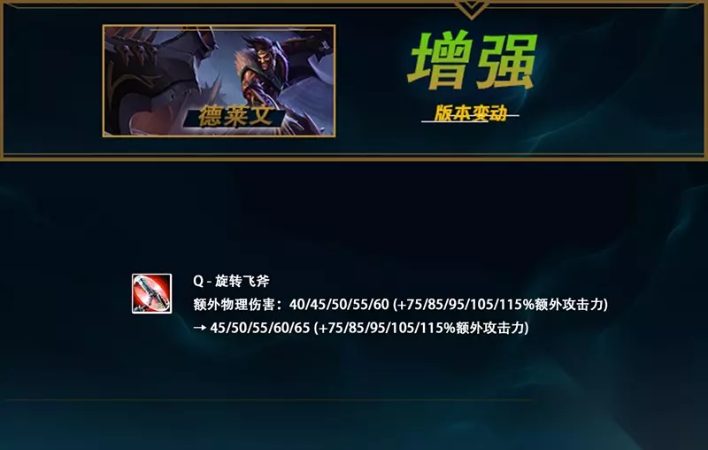 贝蕾亚已经在连续数个版本中进行调整了,在14.6版本中还为贝蕾亚进行了Q可以跳眼等调整。在之前的调整中,基本都是针对于刺客装贝蕾亚的削弱,显然,设计师更鼓励战士流出装。而在这次的改动中,战士流贝蕾亚也受到了较大的削弱,高等级W技能降低了15%的数值。在伤害之外,Q技能的射程提高25码,这对于贝蕾亚的机动性来说是有所提升的。 德莱文 加强