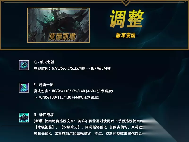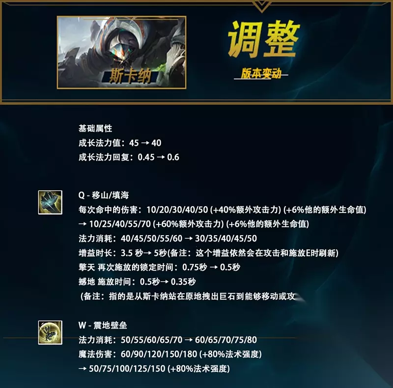 这是一次非常大胆的尝试。铁男的大招将像劫、小鱼人的大招一样,不再能被水银、橘子、诸神黄昏等技能解除。这是对铁男中后期能力的巨大加强,也让船长、奥拉夫等英雄在线上很难对铁男进行counter。值得注意的是,尽管在被关进R的世界后无法通过上述手段解除,但是如果在铁男抬手的时候释放控制免疫效果的技能,那么依旧可以免疫其R技能。 这个改动大大提高了铁男的战略意义,无论是针对对方的C位进行强制关禁闭,还是对于特定阵容(比如进场的吸血鬼、剑魔)进行限制,都有了非常大的意义。 Q技能的前期冷却缩减也进行了下调,铁男前期的换血强度有所提高。相比之下,E技能略微削弱的10点伤害根本无足痛痒。 斯卡纳 调整