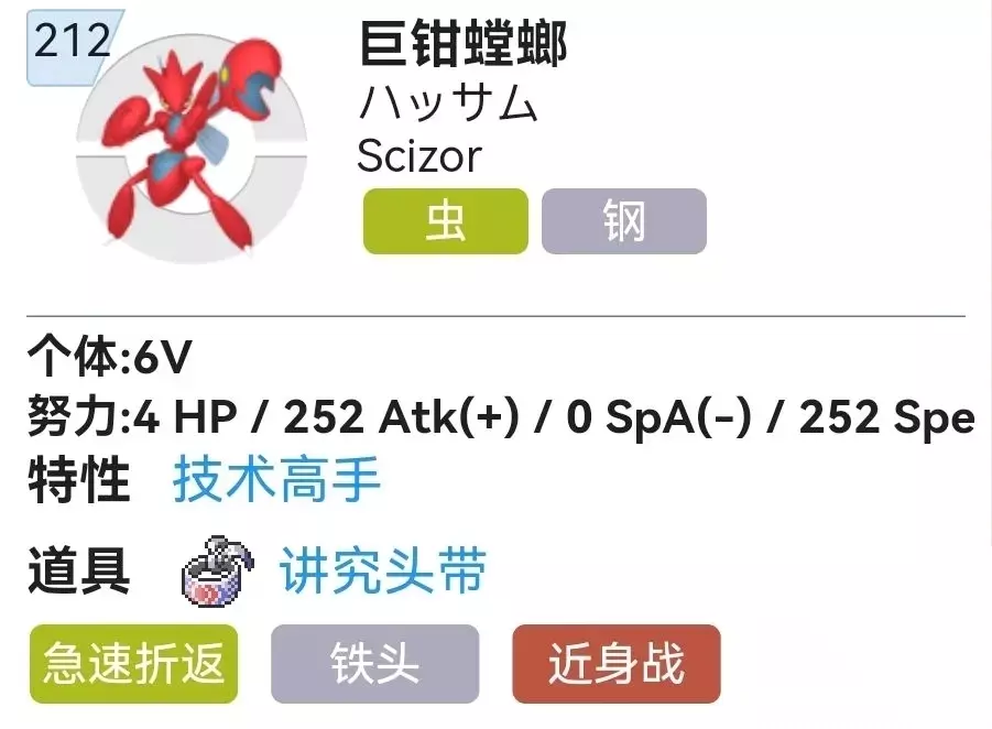 《宝可梦朱紫》巨钳螳螂配招推荐 性格:固执(+攻击-特攻) 特性:技术高手 个体:6v 努力:252攻击252速度4HP 太晶属性:恶 道具:讲究头带 技能:铁头(36)急速折返(机)近身战(机)小偷(机) 功能分析: 巨钳螳螂有着优秀的种族值以及属性搭配,拥有高达8个抗性以及一个免疫,除了有一个致命的火系四倍弱点外几乎没什么明显短板。由于太晶化环境下环境火力越来越高,因此巨钳螳螂并没有选择传统的剑舞子弹拳配置,而是选择了更加暴力追求伤害的讲究头带四攻游击流玩法。 对位优势既可以选择留场输出,也可以选择返走换上后排队友形成对位优势,打击面全面,输出相当可观。 综上所述就是《宝可梦朱紫》巨钳螳螂配招推荐攻略了,现在各位玩家应该知道要怎么配招了吧,希望这篇攻略能为小伙伴们带去一些帮助。