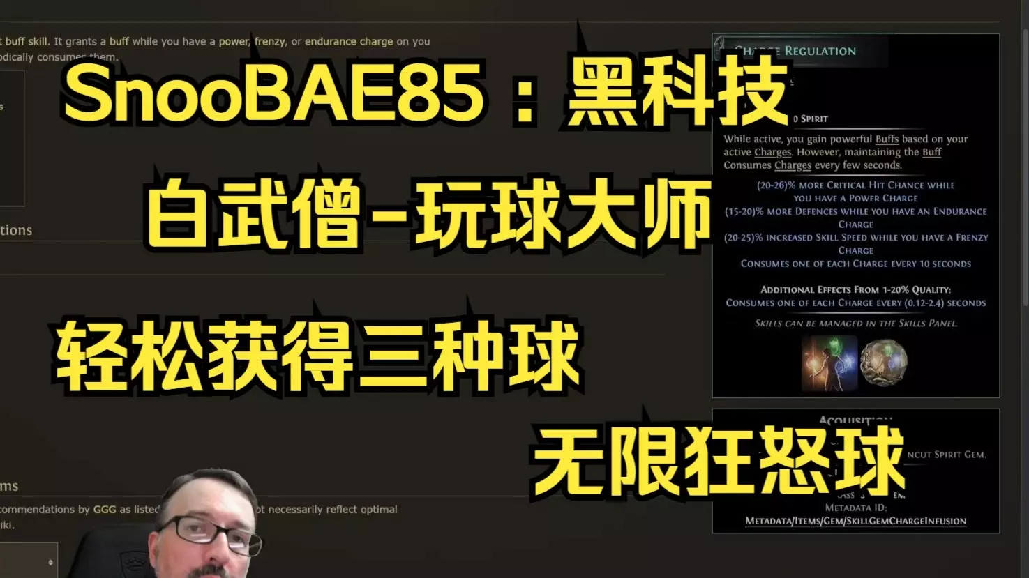 来自SnooBAE85 分享的白武僧高效获取三种球(狂怒球、暴击球、耐力球)的策略。核心是利用“共鸣”基石天赋,将耐力球转换为狂怒球,并结合“充能调节”精魂宝石…