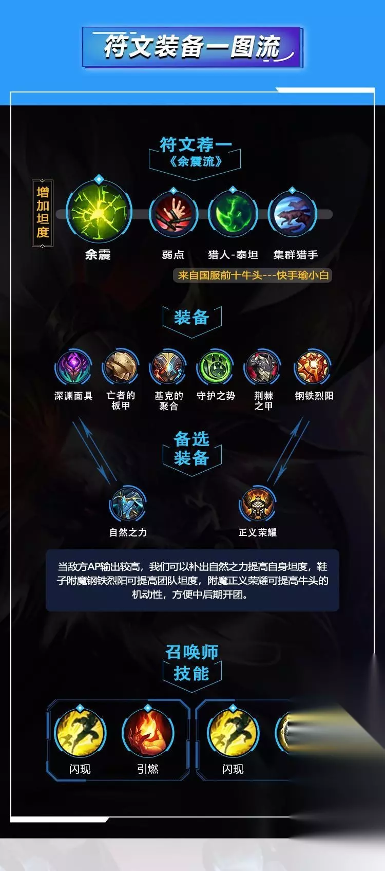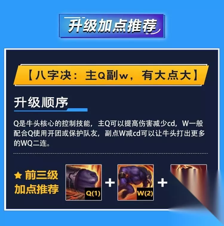 牛头手短的缺点让其很依赖闪现开团小技能CD较长,要注意WQ的释放时机,但牛头的优点在于他拥有较为稳定的点控能力,其WQ的技能机制也让牛头拥有不俗的保护能力以及反打能力,R技能开启后的高额减伤在越塔或团战时也非常好用。