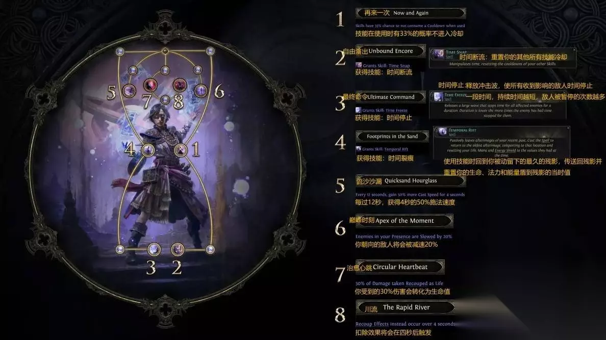 这个升华转玩冰和电,通过增加升华点数,可以给攻击附加冰缓,或者感电这些异常状态,还可以获得元素风暴。 这个技能在法术技能暴击的时候就能自动触发元素风暴, 再配合其他升华点数,来降低元素风暴的冷却,增加触发元素风暴的数量。 防御方面,能够吸收40%元素伤害的能量护盾,适合喜欢玩传统法师的玩家。 02 时空法师