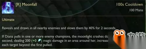 黛安娜变成复仇之月的活体化身,突进到一名敌人身边造成40(+0)的魔法伤害,如果敌人受到月光效果的影响,技能的冷却时间将重置。