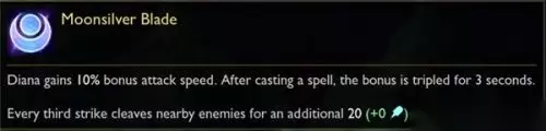 黛安娜获得10%的额外攻击速度。在施放一个法术后,额外攻击速度变为3倍持续3秒。 每第三次攻击顺劈附近的敌人,造成20(+0)点额外魔法伤害。 来看看和当前的被动在机制上有哪些区别: ● 攻击速度不再与月之降临挂钩(现在随角色等级成长) ● 总是提供基础的额外攻击速度,而不是只有在施法后才提供 ● 施法会增加额外的攻击速度 ● 被动的顺劈不再提供法力值 之前黛安娜的被动有很多的规则和机制,都是由于特定的原因对她的线上或者打野进行调整才加入的。稍作研究之后,我们认为可以对被动进行清理和简化,同时以基础属性和法力消耗方面的改动使她的整体感觉变得更好。 这个版本的被动应该很好地还原了她最初的被动,同时保持了她当前被动中与法术互相交织的玩法。 虽然还有很多我没提到的微调,而且随着收集测试服的反馈还会做出进一步的改动,但我非常期待每个人都能看看我们最爱的皎月女神的全新改动。