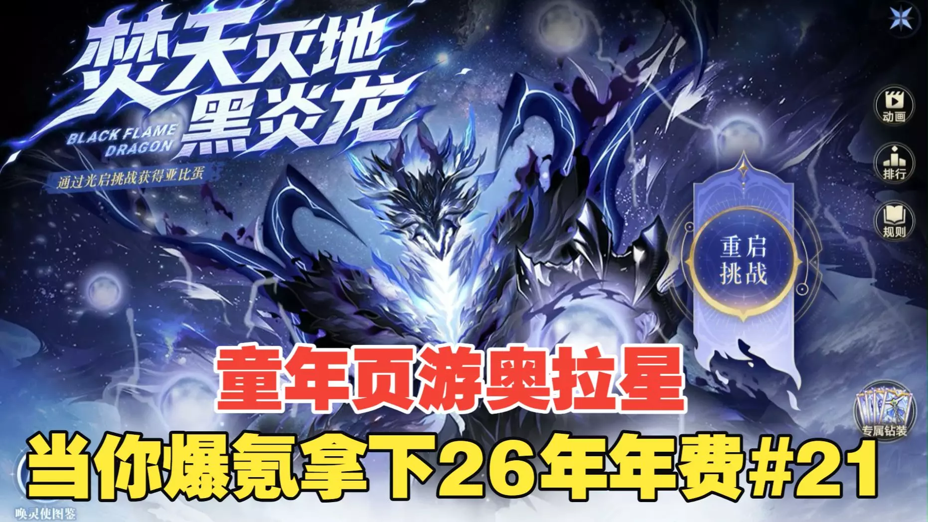 这是奥拉星的通关攻略内容,展示了使用女皇、女帝、年费祈等亚比,全程通关焚天灭地黑炎龙挑战的过程,包含挑战规则说明与实战战斗画面,助力玩家完成该关卡挑战。