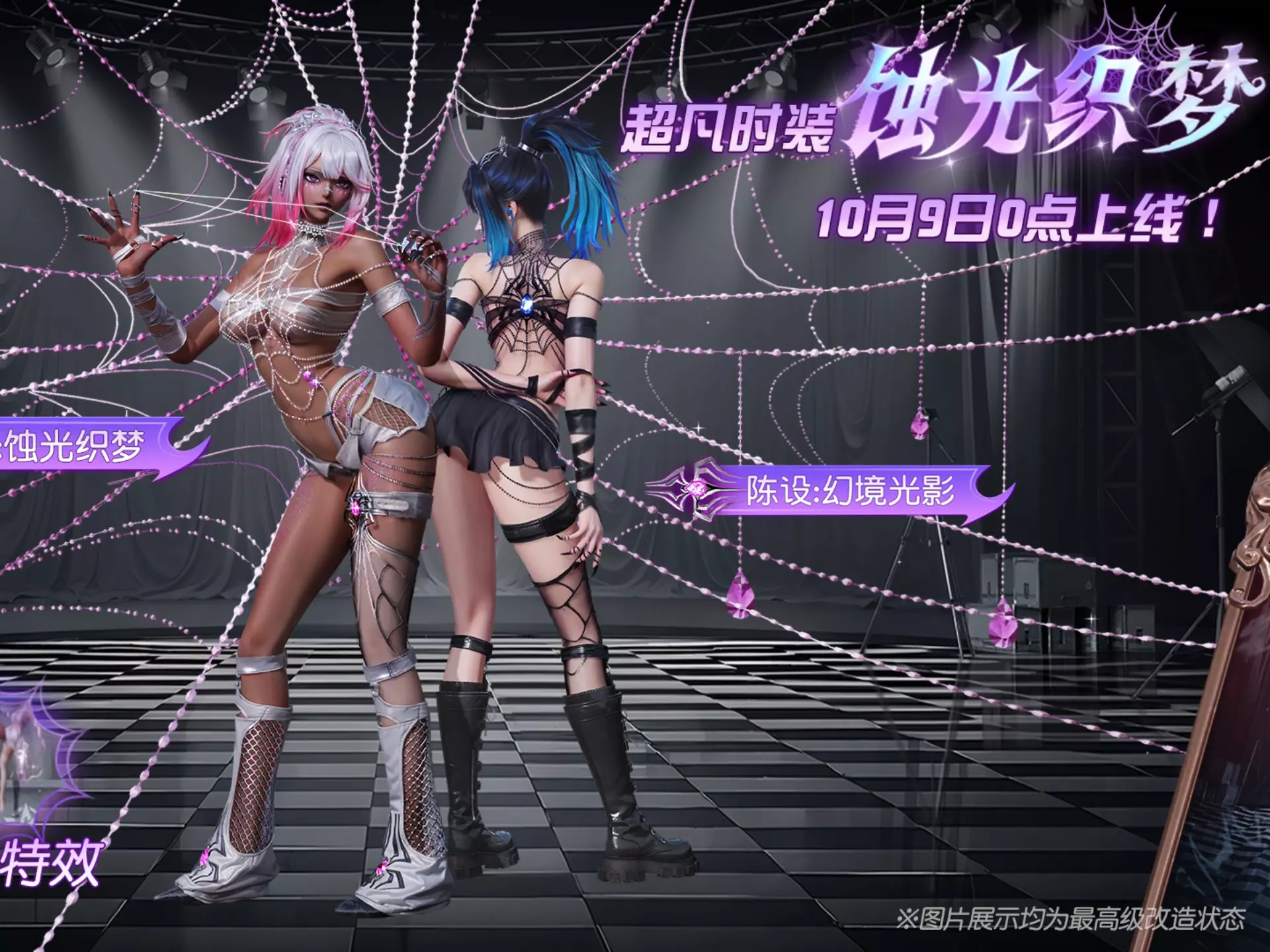 10月9日0点,限定超凡主题【蚀光织梦】系列上线! 时装拥有两套【双人站姿】,有站/跪两种姿态,全新专属双色【翻墙动画&特效】! 可双人展示陈设【陈设:幻境光影…