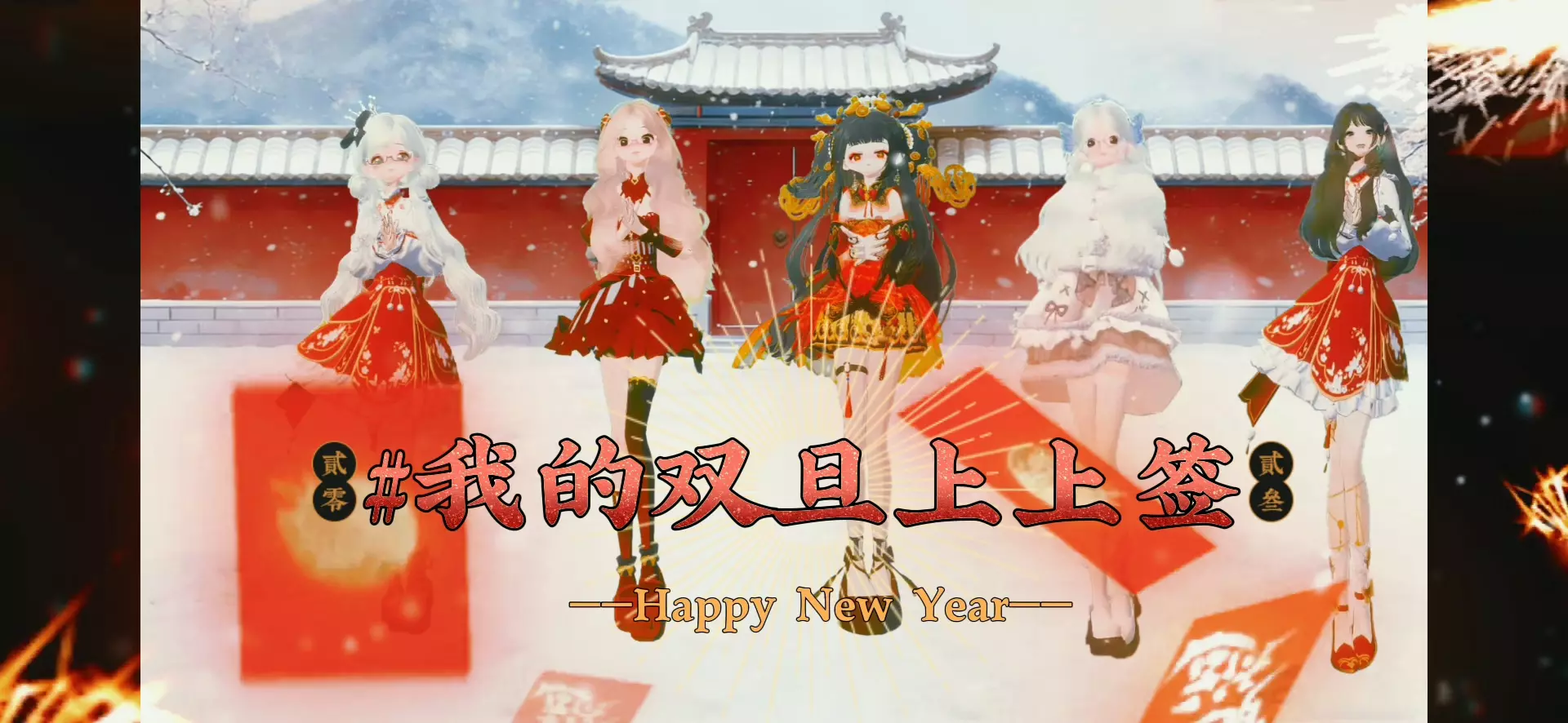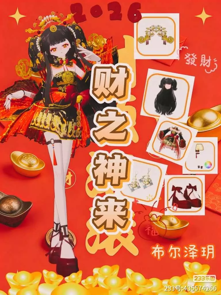 走黑金红国风飒爽路线,黑金配色的短款裙装镶有华丽金纹,搭配精致的金色头饰与红黑绑带鞋,黑发高束的造型利落张扬,金元宝、铜钱等元素环绕,将“财神”的霸气与新年的富贵感拉满。