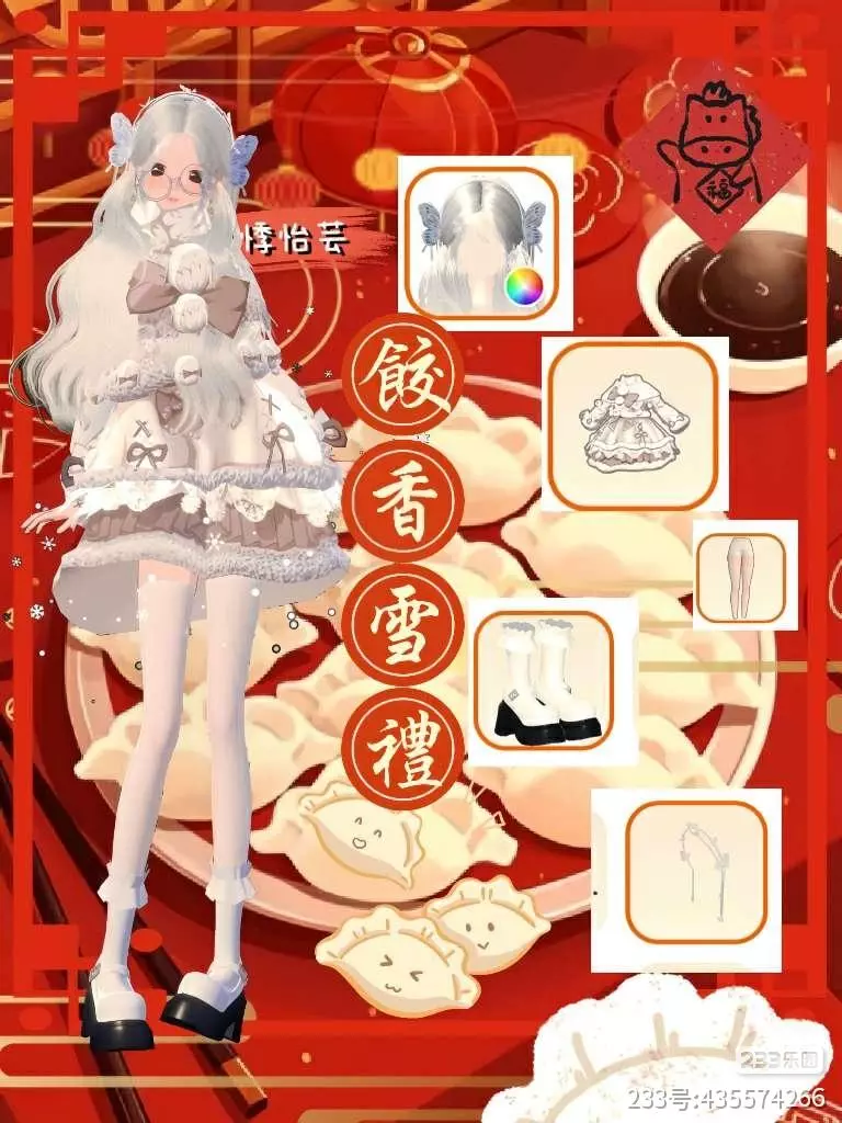 整体是白棕系洛丽塔风新年穿搭,浅银长发搭配毛绒质感的白色蓬裙,裙摆缀有精致花边,搭配白色长袜与黑底小皮鞋,柔美的雪色调与画面中的饺子元素呼应,甜软又透着新年的温馨食韵。