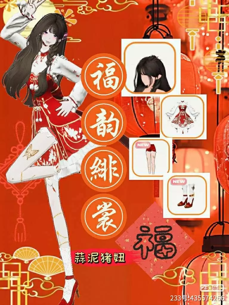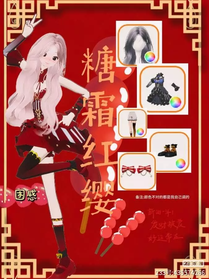 是红黑飒爽系混搭穿搭,红黑撞色的短款裙装设计棱角分明,搭配红黑长袜与运动鞋,浅粉长发利落飘逸,冰糖葫芦元素点缀其间,甜酷的糖霜质感与红缨般的飒气交织,年味里满是个性。