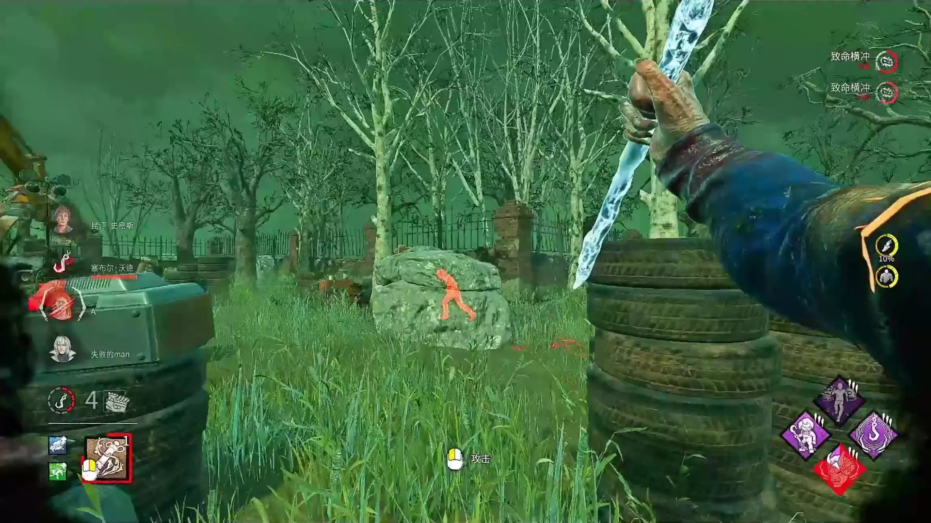 这是黎明杀机游戏的精彩对局片段,人类玩家躲过一刀后被杀手补上击倒一刀,发帖玩家感慨这一刀伤害带来的糟糕游戏体验,展示了黎明杀机对局里刺激的追逃对抗过程。