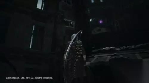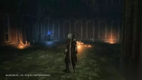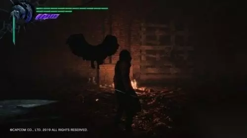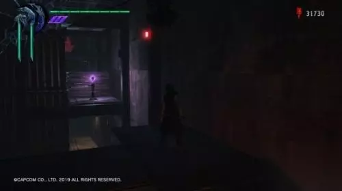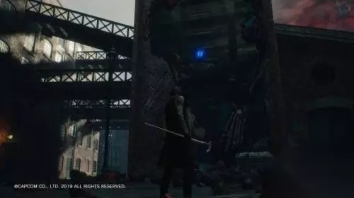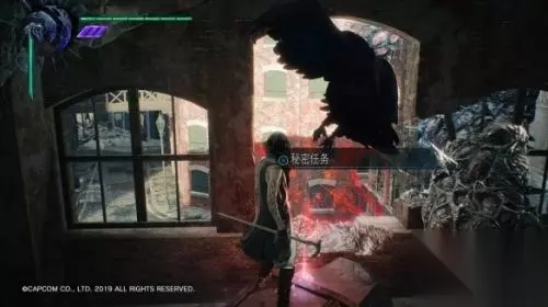 再往前走,会进入一条小巷,出现系统 Devil Trigger 的教学。这里的战斗请把魔人槽蓄满,然后按 L1(LB)召唤魔兽,会破坏附近的一面墙壁,里面有蓝魔魂石碎片,还可得到一个奖杯成就。