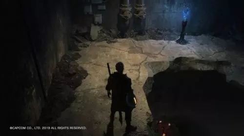 之后先原路回到进来的房间,从碎裂的墙壁出去,沿几个平台跳跃向上,能获得刚才看到的蓝魔魂石碎片。