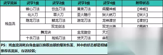 三、残血武学介绍 1、残血类武学一共有21种,武学品阶分为:初级~中级~高级~上乘~珍稀,越高阶的武学伤害越高。 2、一般都是默认用该流派的最高阶武学,没有的武学可以用低阶的代替。 3、残血流:阎摩神威+狱火燃刀+龙神渡世+双龙出海+天龙降世+森罗刑戮。