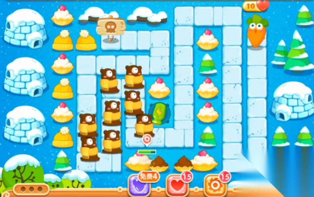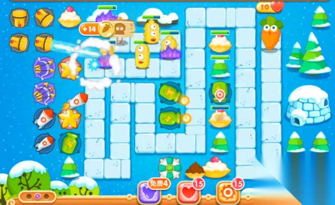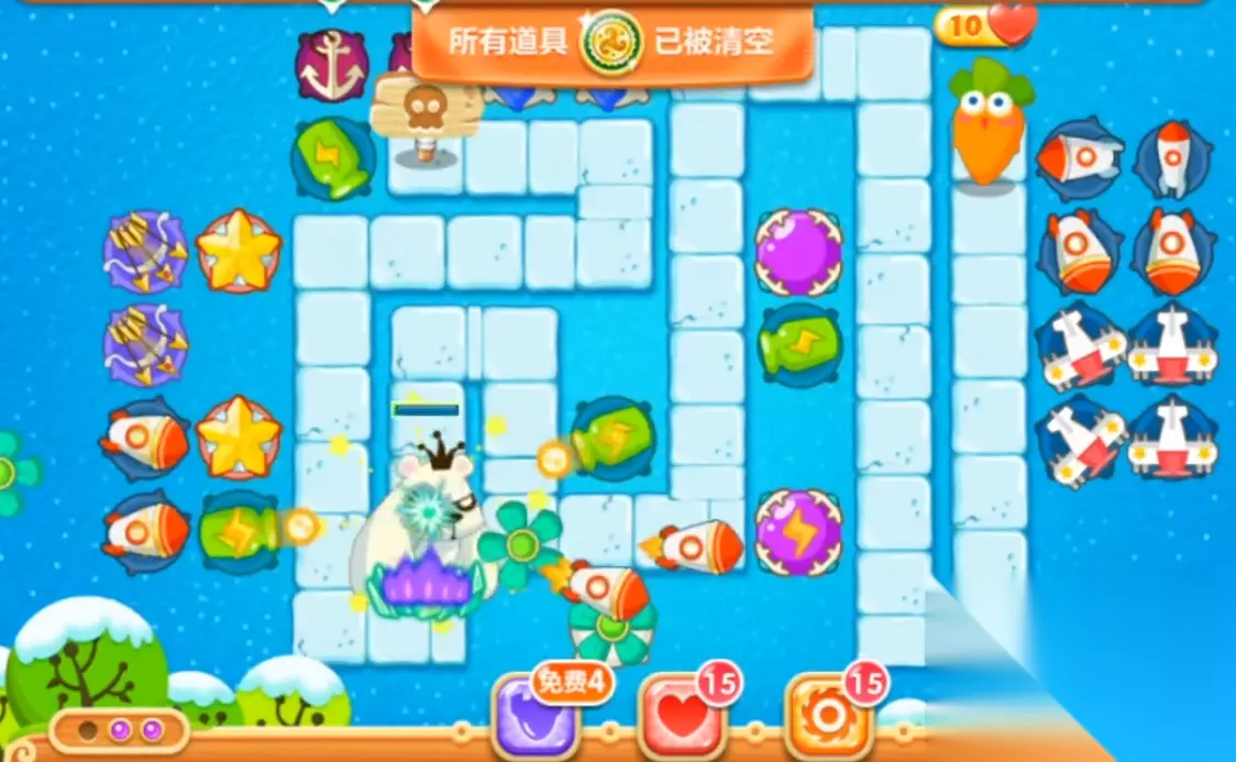 先卖掉位于左手的减速风扇,将其换成三级的瓶子炮,并用它去攻击地图左下方的黄色帽子。这个道具打完后,在它的位置上再建造一个满级的瓶子炮,并向上左上方持续推进,锁定高攻击其上方的第二个黄色帽子。因为这里面藏着一个炸弹,可以帮助我们清理掉地图左边大部分的道具。当这个炸弹爆炸后,我们可以得到两个星星、四个分裂箭和四个火箭。先把地图最边缘的两个分裂箭和两个火箭给卖掉,然后将剩余的炮塔都升到满级。有了这些满级炮塔后,可以把地图左上角的最后一个冰屋给清除掉。这里可以得到四个手电,但是先不升级,因为我们还要留钱去清理右边的道具。