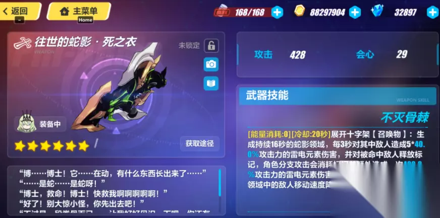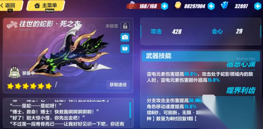 崩坏3无限噬界之蛇装备攻略 武器的话肯定首选往世的蛇影死之衣,该武器的技能就是为无限噬界之蛇量身打造的,武器具有提高伤害并增加额外伤害暴击的主动属性,在玩家主动出击的时候可以给玩家带来全额的攻击加成。被动技能可以给玩家提供一定的恢复能力,同时该武器可以化身为一把战弓,但是这个效果只能持续16s。