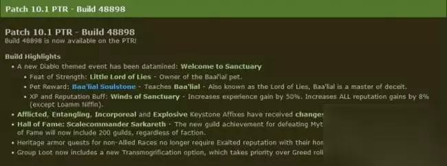 这似乎意味着《魔兽世界》中会推出《暗黑4》限时主题物品,最新的 10.1 PTR 版本定于 5 月 2 日发布,其中提到了怀特之腿、盗宝袋以及赫拉迪克背包等来自《暗黑》世界的物品。圣域之风是一个增加 50% 经验、8% 声望的增益。