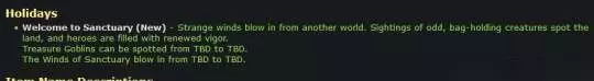 虽然数据挖掘的内容并未被清晰描述,但是可以确认《暗黑4》内容将在不久的将来推出。官方暂未证实宣布这一活动,不过此前于 2017 年《魔兽世界》也举办了《暗黑破坏神》20 周年活动。 活动目前的描述写道:“从另一个世界吹来了怪风。有人看到了奇怪的、拿着袋子的生物出现在了这片土地上,英雄们充满了新的活力。宝藏地精可以从【待定时间】至【待定时间】之间被发现。圣域之风将在【待定时间】至【待定时间】之间吹拂。”