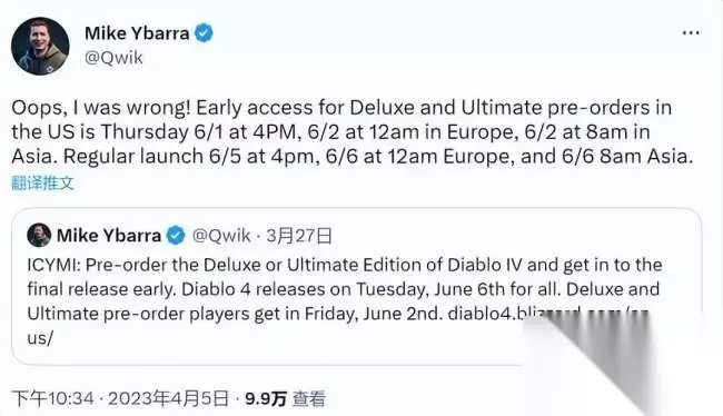 据称,第29赛季的内容将相对精简,不过依旧会有一个全新的赛季主题。需要注意的是,从第30赛季开始,游戏将重复循环此前已有的赛季内容,开发重心也会转移到新的《暗黑破坏神4》。 《暗黑4》全球解锁时间公开 最早6月2日解锁 暴雪总裁Mike Ybarra发推,公布了《暗黑破坏神4》标准版、豪华版和终极版的发售时间。