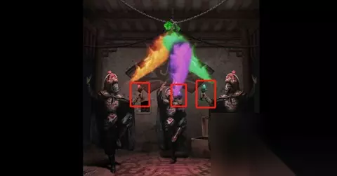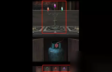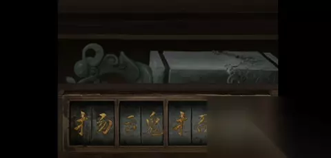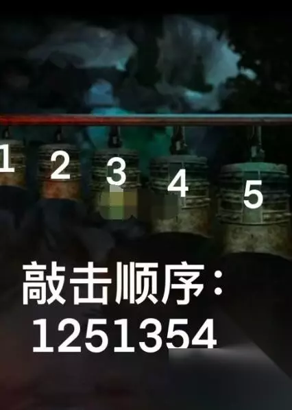 17、将绘制好的猪剪纸和其他两张剪纸投入地下室火锅中,根据显现的提示,在外院鼎中用火柴依次点燃香烛。 18、转动正殿右房间盒子上的玉佩,直至五个按钮全变黑色,解锁金漆盘。 19、用毛笔蘸取金漆,回到正殿巴将军石像前,为石像画上眼睛。 20、最后在八将军石像前恭敬礼拜,献上敬意,由此触动剧情发展。完成对话后即顺利通关。 五、第五章通关攻略 1、启动机关获取道具:完成剧情对话后,进入首个场景。根据图示提示,修复并开启机关以获得鼓槌。调整鼎上的结构(如图所示),得到【鼓槌】;探索商场左侧可找到墙上线索、地摊上拾取【编钟槌】和额外线索,同时在右侧桌子取得【龟形台印】,前方则拿到【撬棍】和【除胶喷雾】。