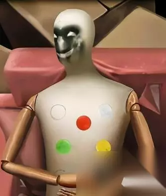 20、右侧书柜使用螺丝刀找到黄块,铁箱中取出红块,将它们安装在假人身上,进而得到“喜”字部件。