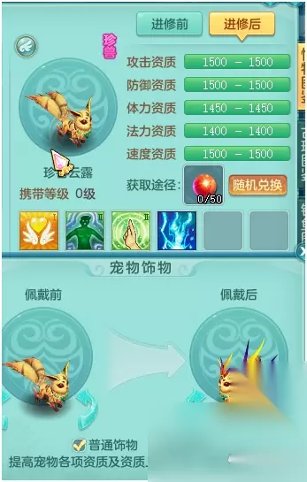 云露带有技能幸运,高感知,高法波和雷动九天。在现在剑气攻宠流行的趋势下,云露要打造成剑气宠的话是需要把所有自带技能都打掉重打的,而且小幸运可能还不是很好掉。 不过,云露在佩戴饰物之后还是很好看的,特别是特殊饰物。再染个色,直接变成“心爱的小摩托”,胖熊相信,云露会是很不错的撩妹助手。