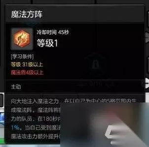【魔法方阵】:这个技能笔者感觉是个鸡肋技能,原因很简单,级别越高团队伤害加成百分比越高,但是满级只有不到4%,而点1级则可以拥有1%,也就是说按技能说明,在PVP中1级的收益是最大的。【魔法方阵】技能可以给自己加个BUFF。